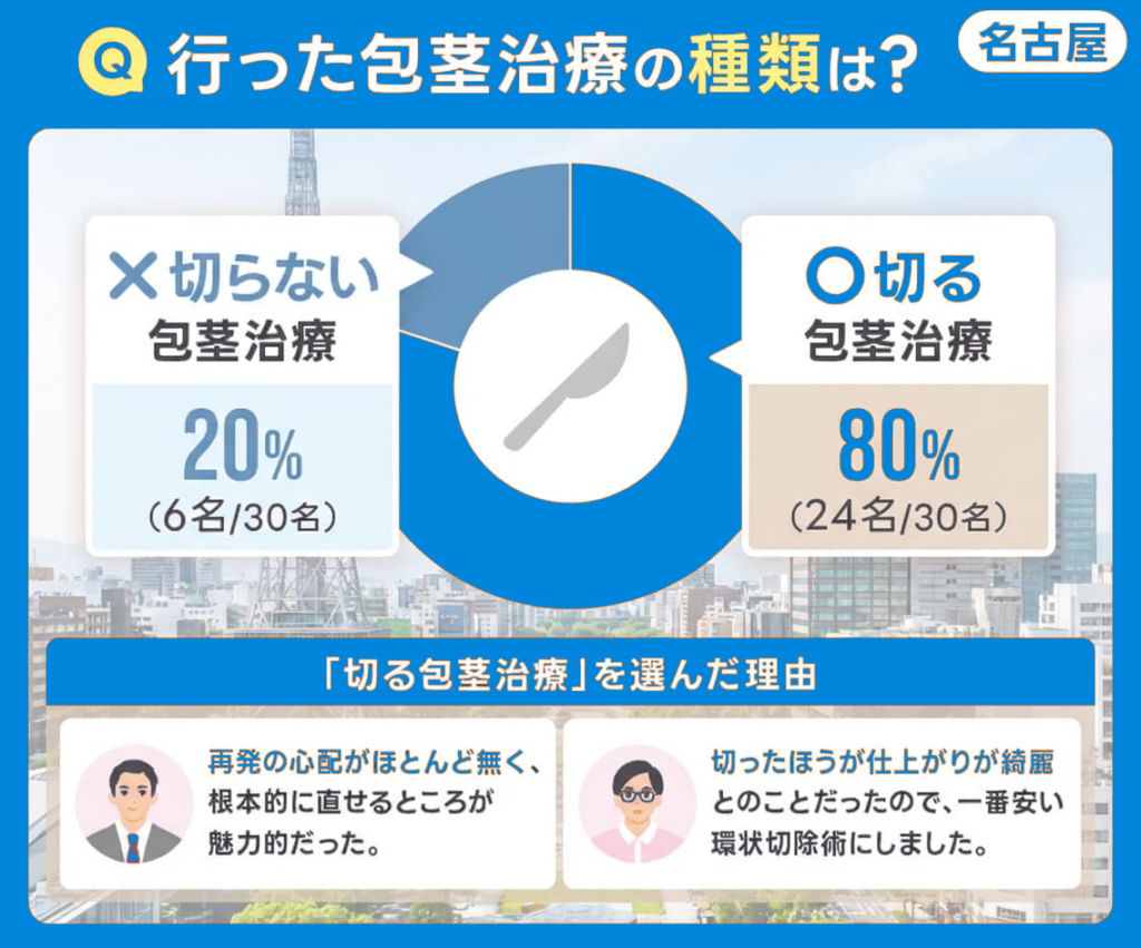 ▽包茎治療を受けた30名にアンケートをとったろころ、初めから「切る治療」を選んだ方が多かったです。